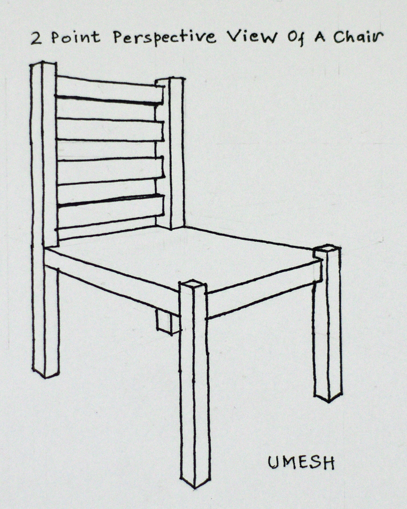 Your sketch of a chair correctly in 2 point perspective (three quarter view).